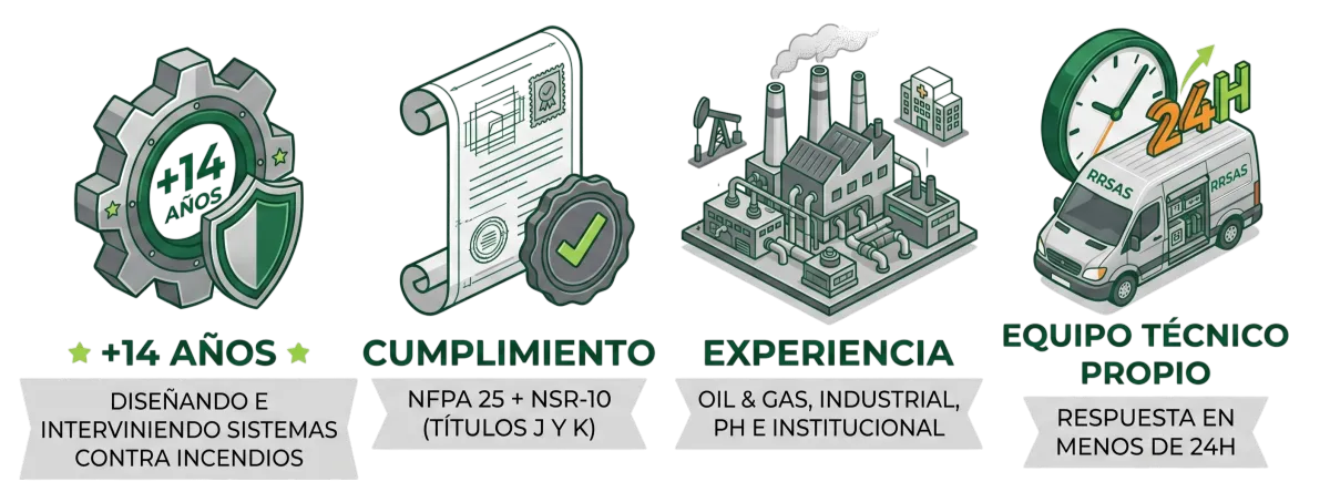 Y hay otra cara: la norma NFPA 25 exige pruebas y mantenimientos con periodicidad definida. No cumplirla expone a la empresa a sanciones de bomberos y autoridades, anulación de pólizas, y responsabilidad civil en caso de siniestro.